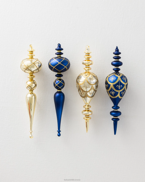- Feature assorted balls, finials, onions, and drop ornaments in sapphire and gold hues
