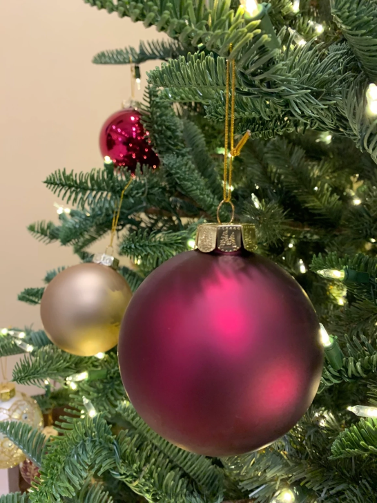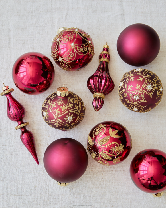 - Feature balls and finials in wine hues with glitter and pearl accents