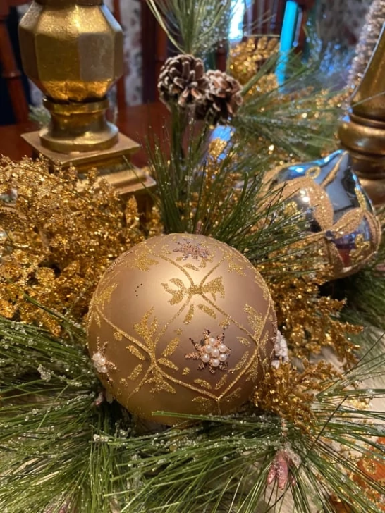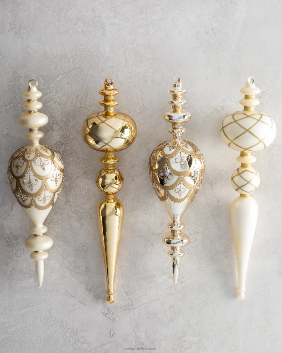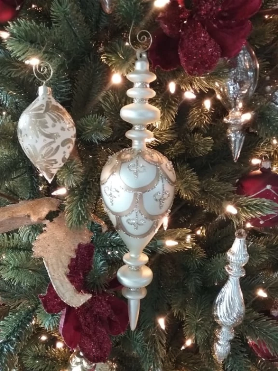 - Feature assorted balls and finials in metallic hues with glitter, pearl, and faux crystal accents