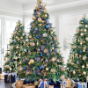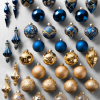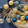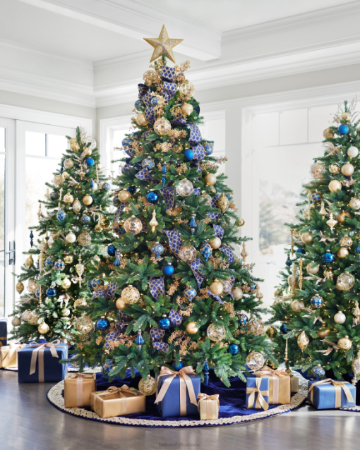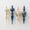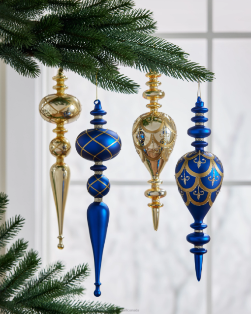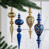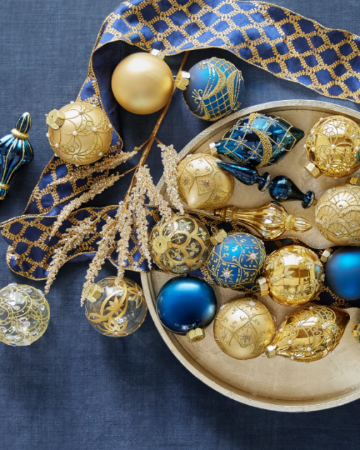 - Feature assorted balls, finials, onions, and drop ornaments in sapphire and gold hues