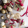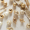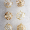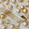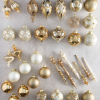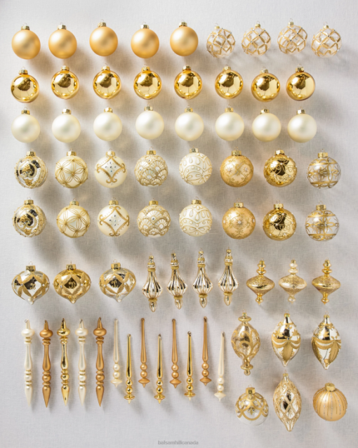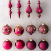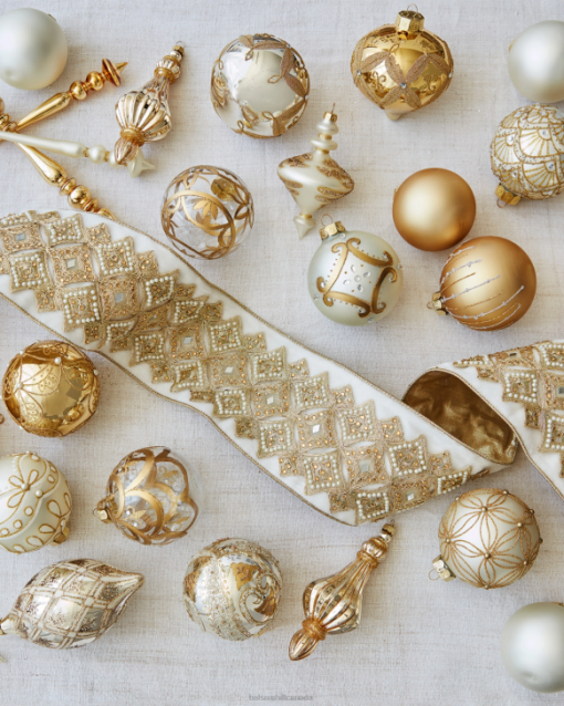 - Feature assorted balls and finials in metallic hues with glitter, pearl, and faux crystal accents