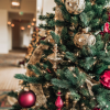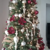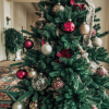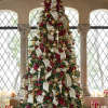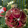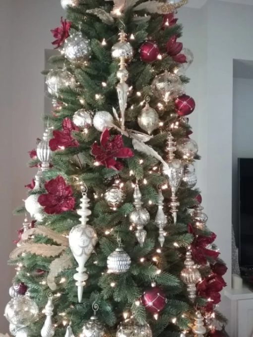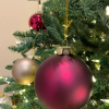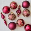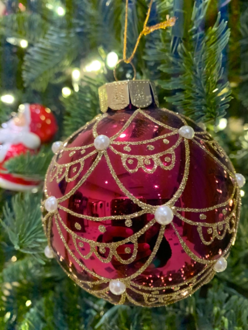 - Feature balls and finials in wine hues with glitter and pearl accents