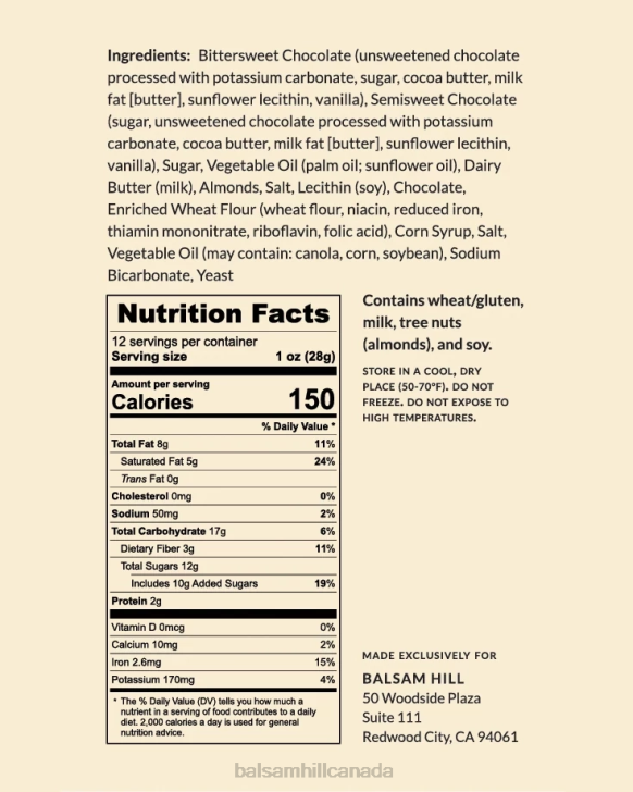 - Ingredients: Bittersweet Chocolate, Sunflower Lecithin, Vanilla, Semisweet Chocolate, Sugar, Vegetable Oil, Dairy Butter, Almonds, Salt, Lecithin, Chocolate, Enriched Wheat Flour, Corn Syrup, Sodium Bicarbonate