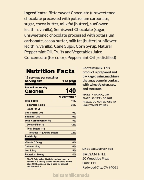 - Ingredients: Semisweet Chocolate, Sunflower Lecithin, Vanilla, White Chocolate, Cane Sugar, Corn Syrup, Natural Peppermint Oil, Fruits and Vegetables Juice Concentrate