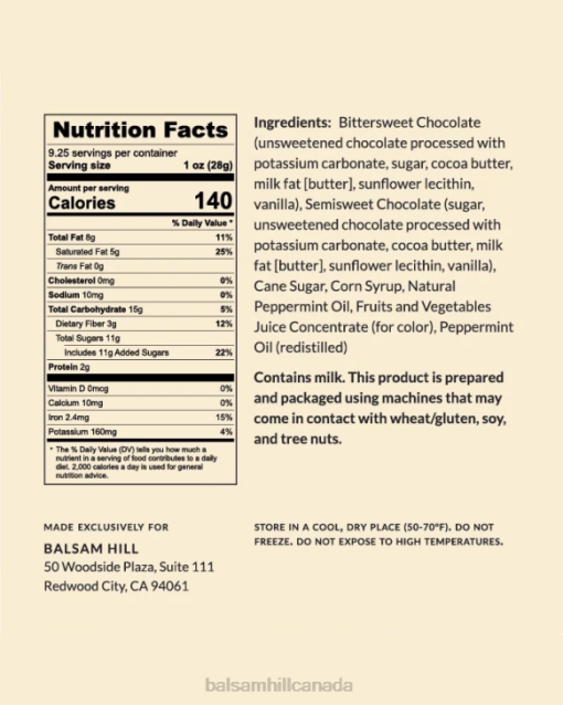- Ingredients: Semisweet Chocolate, Sunflower Lecithin, Vanilla, White Chocolate, Cane Sugar, Corn Syrup, Natural Peppermint Oil, Fruits and Vegetables Juice Concentrate