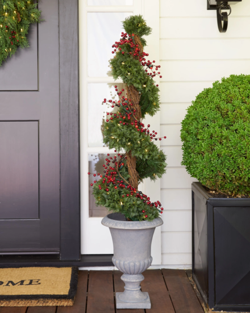 - Red berry garland on topiary requires 3 AA batteries; not included