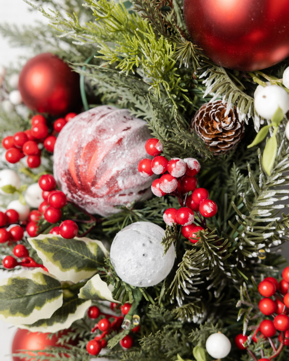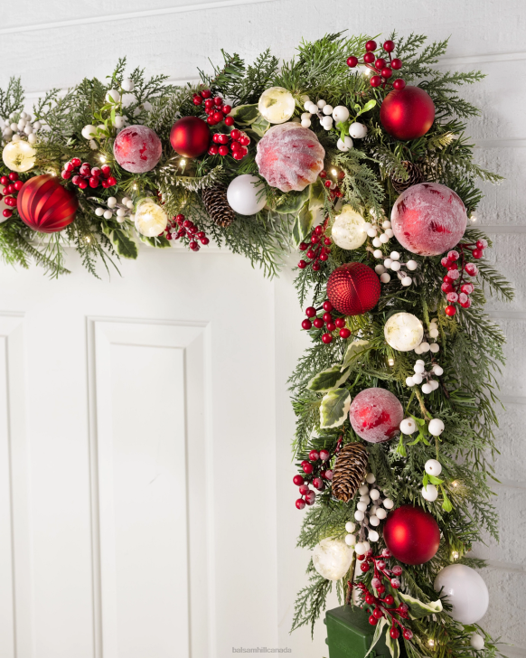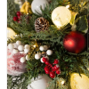 Classic red and white accents on lifelike greenery never go out of style. Combine with similar themed decor to complete your Scandinavian holiday look.