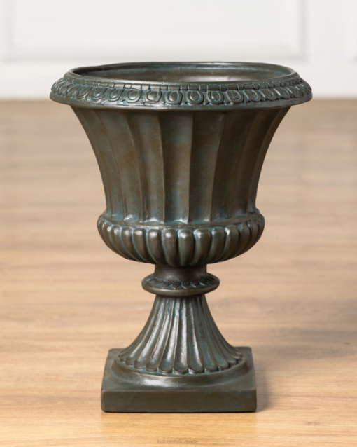 - Set in a gray resin vessel with bronze finish measuring 11”in diameter x 13.75”high