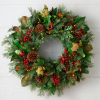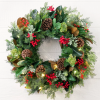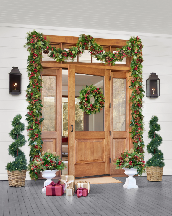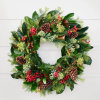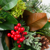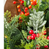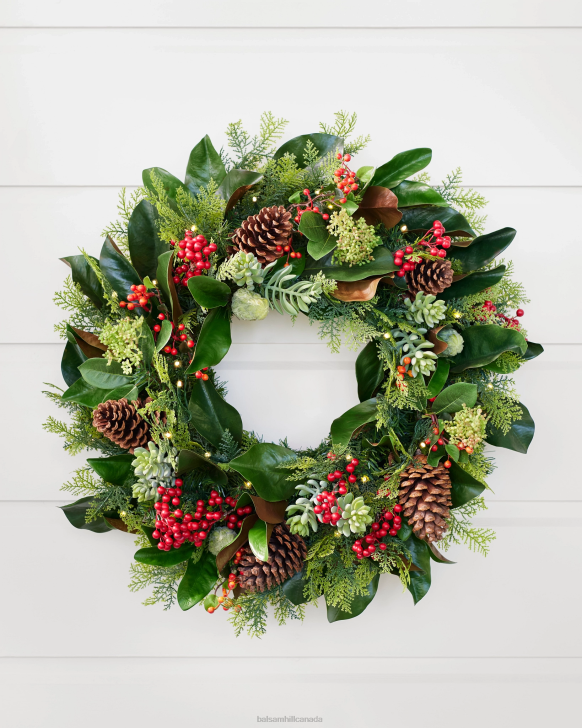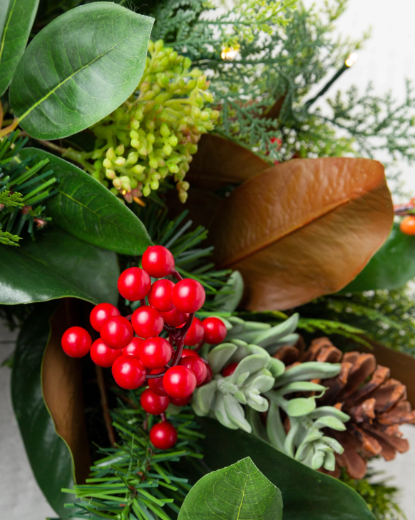 - All products in this collection feature pine foliage mixed with lifelike magnolia leaves, accented with faux succulents, red berries, and natural pinecones.