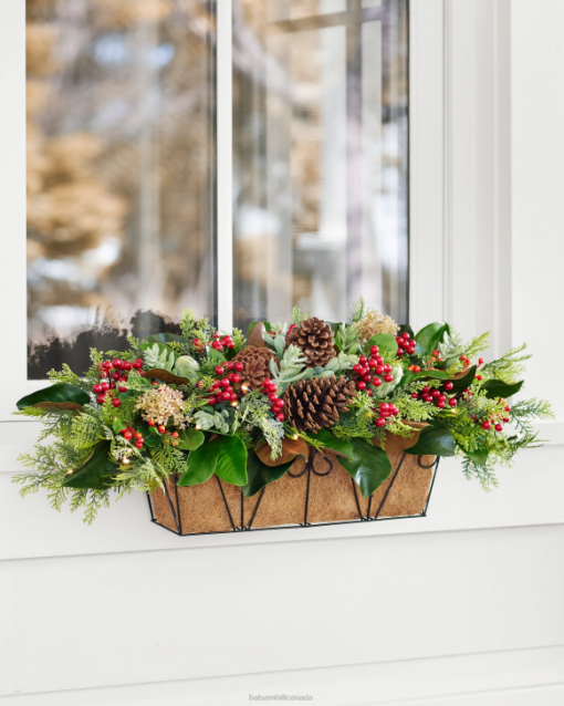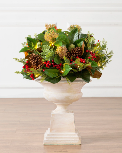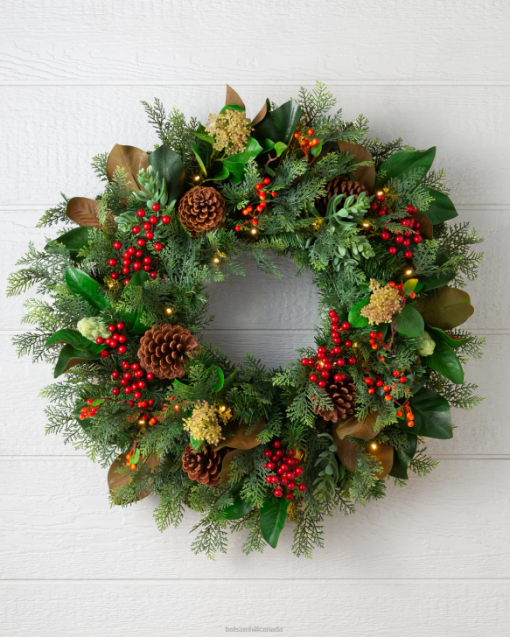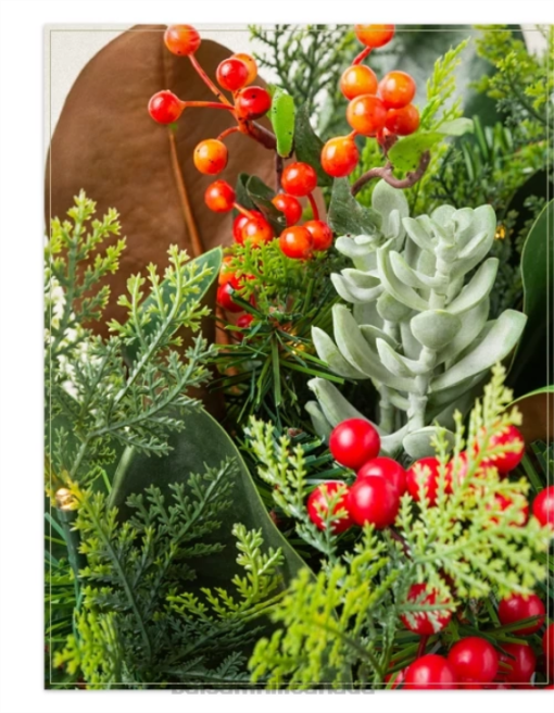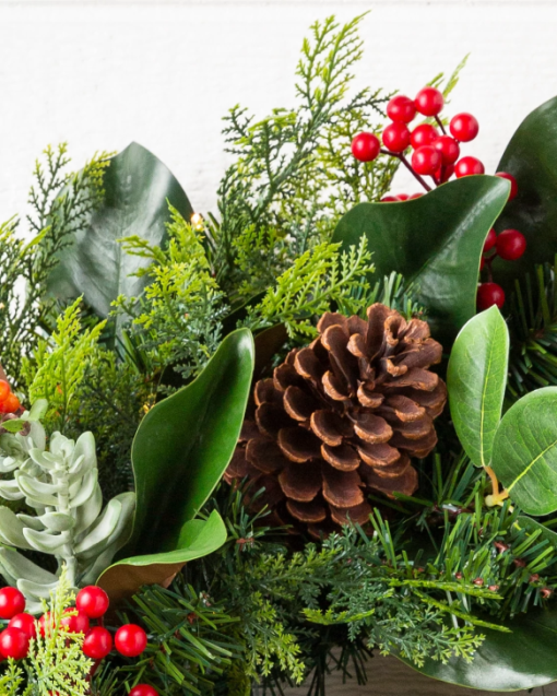 - All products in this collection feature pine foliage mixed with lifelike magnolia leaves, accented with faux succulents, red berries, and natural pinecones.