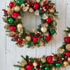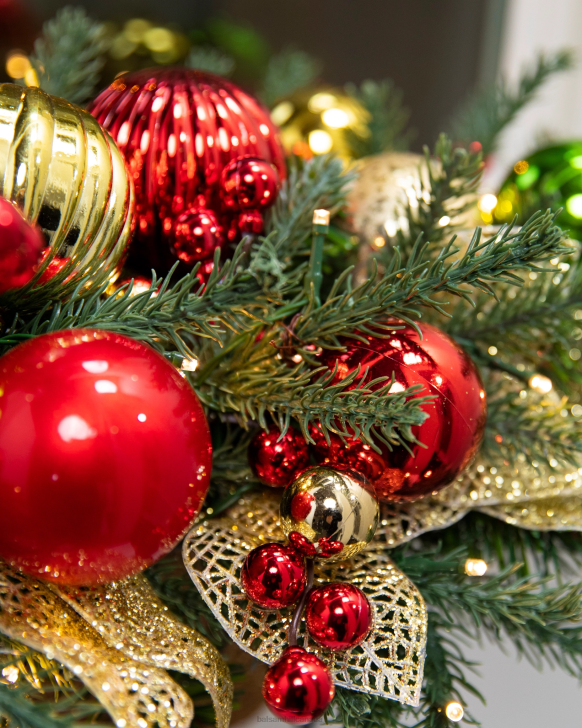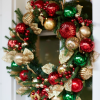 - All products in this collection feature gold glitter leaves, red and gold berry sprays, and red, green, and gold shatter-resistant ornaments.