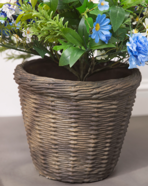 - Set in a resin vessel with a wicker basket look measuring 12” in diameter x 10” high