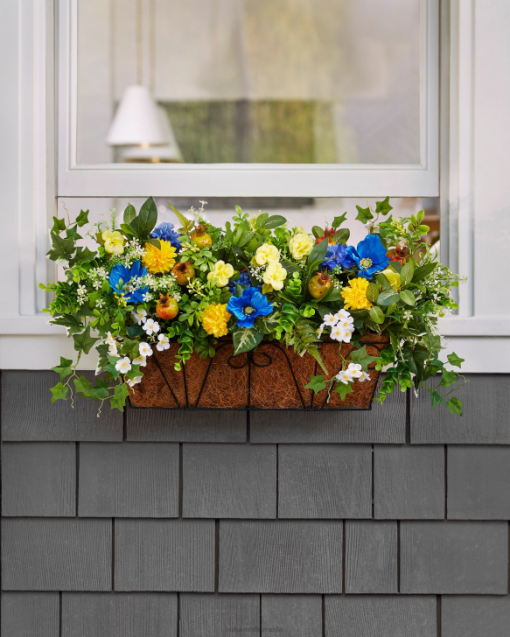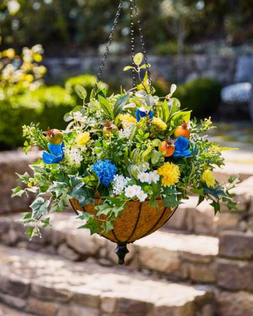 - Set with coconut coir in a metal-framed carrier measuring 12” in diameter