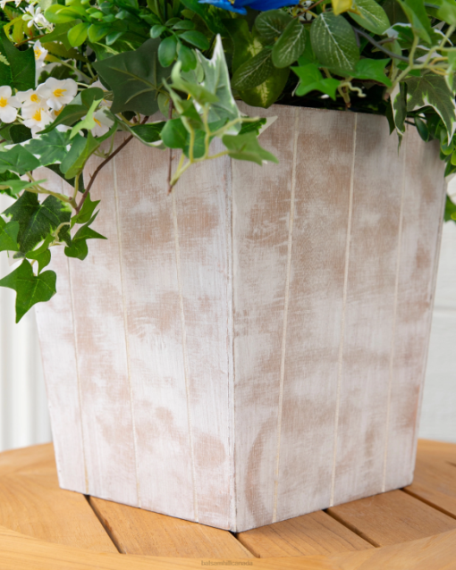 - Set in a wooden vessel with a whitewashed finish measuring 11” long x 11” wide x 11.75” high