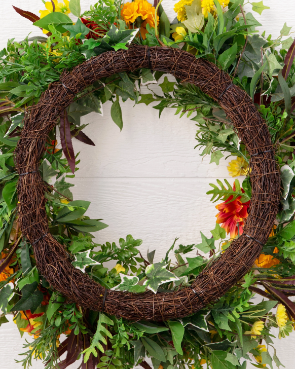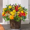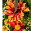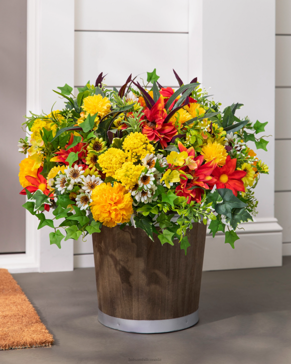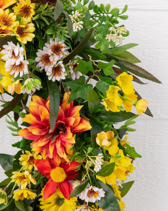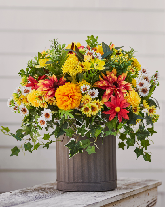 - All products in this collection feature an array of faux flowers, including dahlias, small daisies, carnations, ivy, and desert narrow leaves