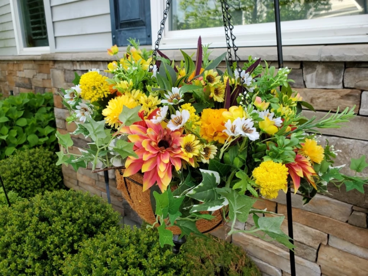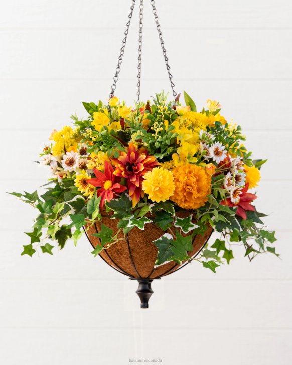 - Set with coconut coir in an iron-framed carrier measuring 12” in diameter