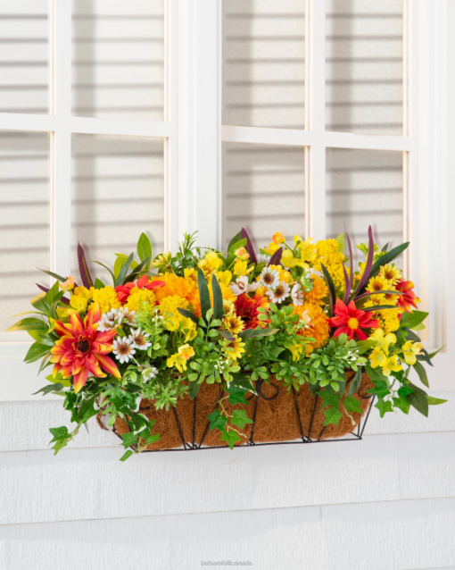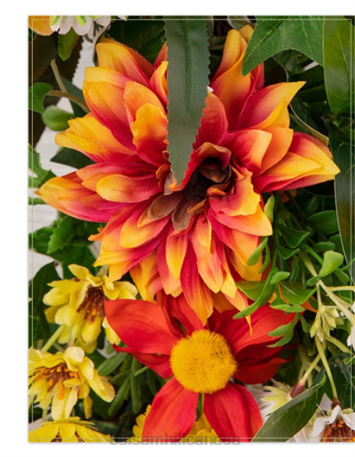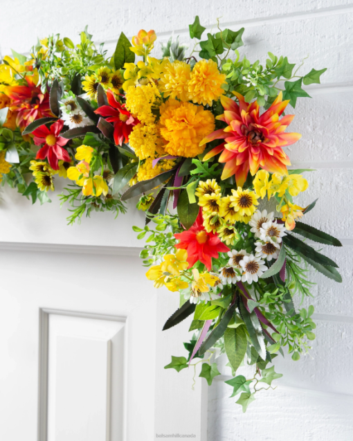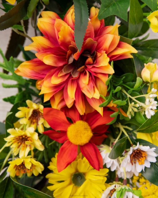 - All products in this collection feature an array of faux flowers, including dahlias, small daisies, carnations, ivy, and desert narrow leaves