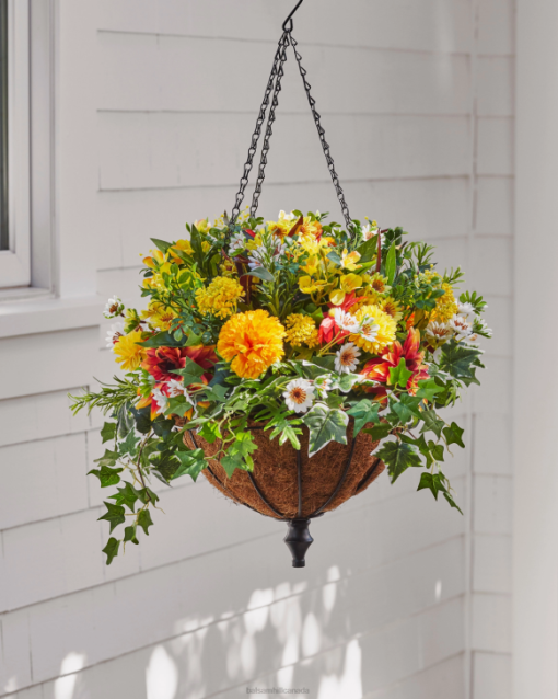 - Set with coconut coir in an iron-framed carrier measuring 12” in diameter