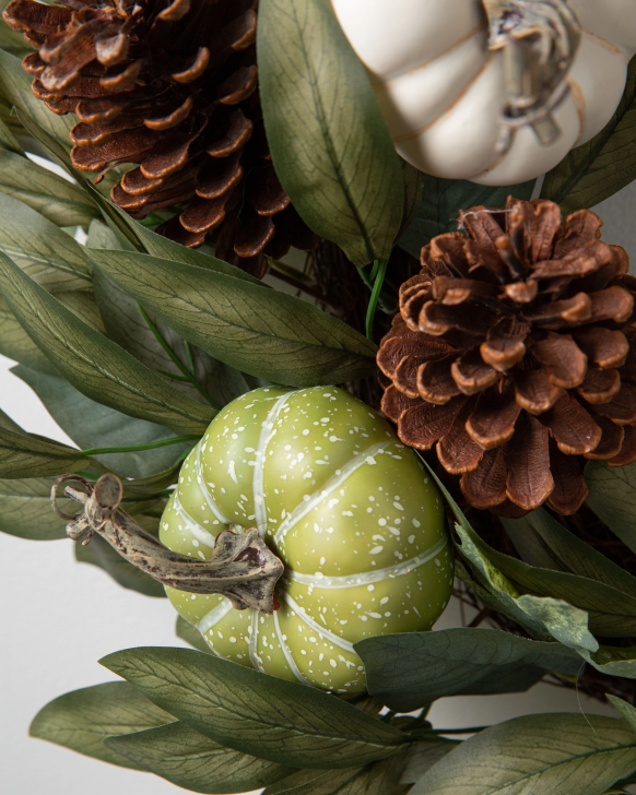 - All products in this collection feature pumpkins, pinecones, and eucalyptus leaves